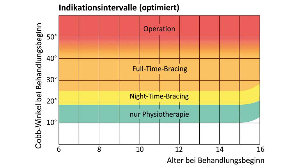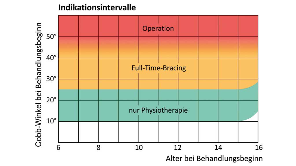 International wird bei Winkeln über 10° Cobb Physiotherapie empfohlen, bei Progredienzen auf 25° Cobb erfolgt der Wechsel zur Korsetttherapie in Ganztagsorthese (Full-Time-Bracing) mit ergänzender Physiotherapie. Bei Winkelwerten über 40° Cobb wird (abhängig von Alter, Lokalisation und Versteifungsstrecke) ein operatives Vorgehen erwogen (Abb. 2).