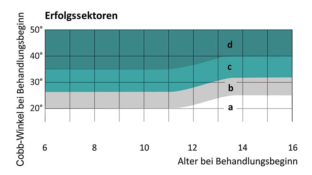 Der Erfolg einer Korsetttherapie ist abhängig vom Ausmaß der Deformität zu Behandlungsbeginn und der Zeitspanne des noch bevorstehenden Wachstums (Abb. 3). Es gäbe durchaus einen Bereich frühzeitig Korsett-behandelter Skoliosen, in dem man eine Winkel-Regredienz erwarten könnte (Sektor a), aber genau dieser Bereich wird meist gar nicht genutzt. Bei mittleren Ausgangswinkeln (Sektor b) reduzieren sich die Erfolgsaussichten in den meisten Fällen auf das Erhalten des Winkelwertes nach Korsettablage. Definiert man die Erhaltung des Winkels als „Behandlungserfolg“, erzielt eine Korsettbehandlung in den Sektoren a und b grundsätzlich erfolgversprechende Ergebnisse. Bei höheren Ausgangswinkeln (Sektor c) muss man im Endergebnis nach Korsettablage oft eine moderate Verschlechterung hinnehmen und bei hohen Winkelwerten (Sektor d) ist die Korsetttherapie oftmals überfordert. In den Sektoren c und d ist nachhaltiger „Erfolg“ mühsam oder gar nicht erreichbar 9. Grundsätzlich deckt sich der empfohlene Indikationsbereich nicht unmittelbar mit dem erfolgreichen Bereich und man arbeitet mit Korsetts zum erheblichen Teil in den schwierigeren Bereichen. National ist die Lage etwas günstiger, da man in Deutschland Korsettversorgungen vielerorts schon bei 20° Cobb beginnt und damit den erfolgreichen Bereich besser ausnutzt 10.