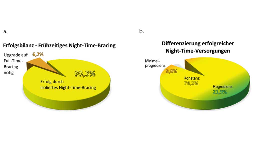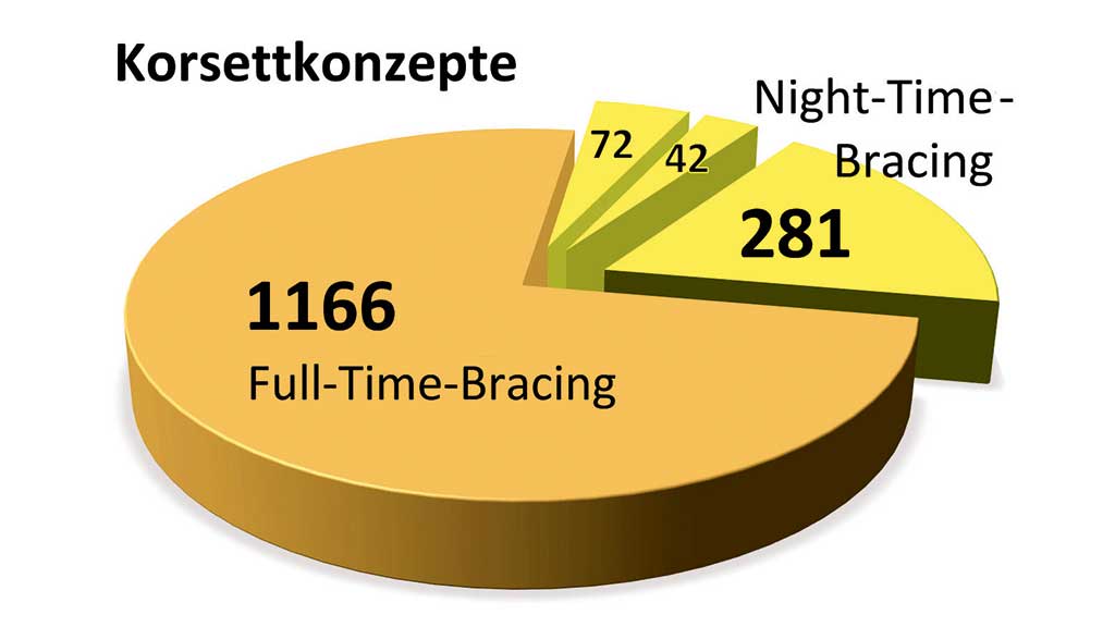 Betrachtet man die Gesamtheit der idiopathischen Skoliose-Patienten im Wachstumsalter, werden derzeit 75 % von ihnen mit Winkeln über 25° Cobb zur Erstvorstellung in Skoliose-Spezialambulanzen vorstellig und kommen damit zu spät für ein isoliertes Night-Time-Bracing. Diese Patienten sollten auch in Zukunft mit dem traditionellen Konzept ganztags Korsett-versorgt werden, wobei es perspektivisch wünschenswert wäre, die Rate durch gezielte Früherkennung spürbar zu verringern.
