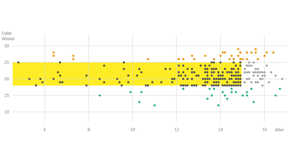 Die Auswertung konzentriert sich auf das „entscheidende Kriterium“ der Vermeidung eines Tagkorsetts und somit auf die Fragen: Wie viele der 150 im Empfehlungsbereich gestarteten Patienten konnten per isoliertem Nachtkorsett im gesamten Wachstum stabil gehalten werden bzw. bei wie vielen Patienten hat sich der Winkelwert während des Wachstums über die 25-Grad-Marke hinaus verschlechtert, so dass noch eine reguläre Tagorthese nötig wurde? Die zentrale Frage lautet: Brauchte das Kind später im Wachstum noch ein zusätzliches Tagkorsett oder nicht?