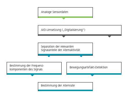 Nach dem Aufbau des Prototyp-Betts wurde zunächst ein robustes Verfahren zur Detektion der Atemaktivität entwickelt, das die große Variabilität der Nutzsignalanteile, eine Störung durch Bewegungsartefakte sowie externe Störeinflüsse berücksichtigt und eine Detektion einzelner Atemzüge ermöglicht, um die sonst übliche Zusammenfassung der Atemrate in Epochen zu vermeiden. Die Informationen über einzelne Atemzüge können z. B. zur Detektion von Apnoen genutzt werden. Das Verfahren adaptiert einen Ansatz aus der Sprachsignalverarbeitung für die Nutzung in der Biosignalverarbeitung und wurde durch zusätzliche Methoden zur robusten Signalverarbeitung ergänzt, um Einflüsse von Bewegungsartefakten zu detektieren und Störungen zu kompensieren.