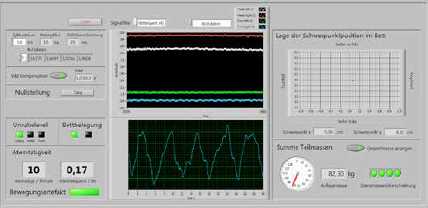 Alle Sensorsignale werden parallel über einen A/D‑Umsetzer unter Verwendung des sogenannten Bed-Side-Servers erfasst und verarbeitet. Somit ist eine latenzfreie Weiterverarbeitung der Signale gewährleistet. Einen Überblick über das Gesamtsystem vermittelt Abbildung 4. Die Sensordaten können mittels eines Userinterface visualisiert werden. Die Bedienoberfläche für Test- und Evaluierungszwecke ist in Abbildung 5 dargestellt. Hier werden neben der Darstellung der Rohdaten eines der beiden Sensorsysteme zusätzlich die Körperschwerpunktlage, das Gewicht der Person im Bett, die Bettbelegung, ein Indikator für Unruhe sowie die aktuelle Atemrate angezeigt. Als Softwareentwicklungsumgebung wurde LabVIEW von National Instruments verwendet. Die in Abbildung 4 gezeigte kommunikationstechnische Anbindung ist derzeit nicht ausgeführt, aber in einer späteren Ausbaustufe vorgesehen.
