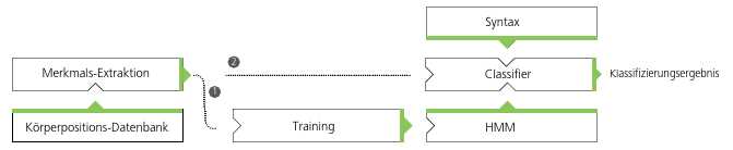 Das System wurde in einer ersten Instanz als sogenanntes Offline-System aufgebaut. Das bedeutet, dass gespeicherte Testdaten verwendet werden, welche die Sensordaten vorgegebener Abläufe enthalten. Dieser Punkt ist in Abb. 8 als „Körperpositionsdatenbank“ dargestellt. Um entsprechende HMMs generieren zu können, bedarf es neben einem sogenannten Training einer Merkmals-Extraktion. Diese dient dazu, relevante spektrale Merkmale aus den Daten zu extrahieren. Das Training der Modelle und die Erkennung werden unter Verwendung angepasster HTK-Funktionen durchgeführt. Der Erkenner („Classifier“ in Abb. 8) wird mit einer sogenannten Syntax derart gesteuert, dass eine „freie“ Erkennung einzelner Körperlagen und der dazugehörenden Aktionen möglich ist. Ein Beispiel für die Syntax wird in Abbildung 9 gegeben.