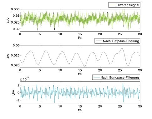 Der gefilterte Signalverlauf in Abbildung 2 Mitte stellt den aus der Atemaktivität resultierenden sinusförmigen Signalverlauf dar. Im gefilterten Signalverlauf in Abbildung 2 unten wird eine Folge von BKG-typischen Komplexen bedingt durch die Herzaktivität deutlich. Den „Beginn“ der modernen Ballistokardiographie stellt ein von Starr 5 1939 entwickeltes System dar. Elektrische und mechanische Restriktionen führten aber dazu, dass die BKG zunächst keine weitere Beachtung fand. Erst nachdem Anfang 1980 ein gesteigertes Interesse an präparationsfreien Messsystemen bestand und sich der Fokus von der Diagnose und Prognose kardiovaskulärer Erkrankungen in Richtung der Monitoringsysteme verschob, wurde die BKG wiederentdeckt. Ein Durchbruch gelang Koivistoinen 2004 6 bei der Entwicklung eines funktionalisierten Stuhls. Hierbei wurden Sensoren in die Sitz- und Lehnfläche eingearbeitet, durch die Herz- und Atemaktivität abgeleitet werden konnten. Als weitere Basis bietet sich das Bett für Langzeitmessungen an, da hier eine Aufenthaltsdauer von sechs Stunden und mehr für eine Messung zur Verfügung steht. So existieren Messaufbauten, die als Sensor einen Drucksensor in einer Luftmatratze verwenden und aus der Änderung des Luftdrucks die Herz- und Atemaktivität ableiten. Des Weiteren werden auch im Bettgestell oder unter den Bettfüßen integrierte Kraftmesszellen zur BKG-Ableitung eingesetzt.