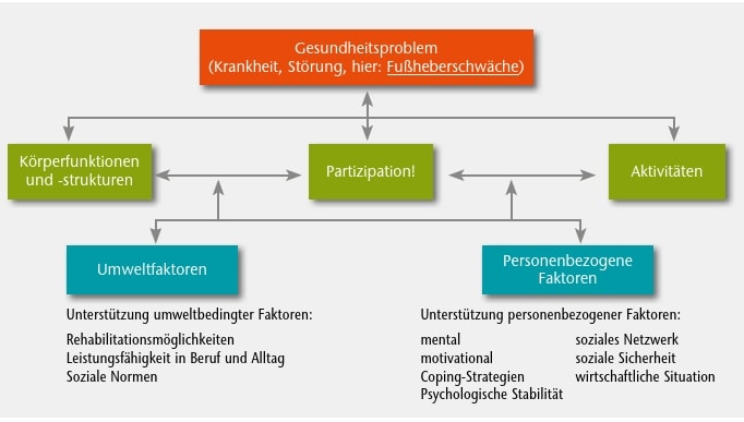 Gerade Patienten nach Schlaganfall zeigen häufig eine ausgeprägte Fußheberschwäche, folglich ein erhöhtes Sturzrisiko sowie reduzierte Gehgeschwindigkeit und Gehstrecke: Drei Monate nach einem Schlaganfall sind bei knapp 70 % der Patienten die Fuß- und Beinfunktionen massiv beeinträchtigt, 25 % beklagen einen vollständigen Verlust. Neben den gestörten Körperfunktionen sind insbesondere auch Aktivität und Partizipation am sozialen Leben betroffen. Die Folge: Viele Patienten werden nach und nach sozial isoliert. Entsprechend stehen demnach nicht nur die Körperfunktionen und ‑strukturen im Fokus einer Hilfsmittelversorgung, sondern gemäß der „International Classification of Functioning, Disability, and Health” (ICF, Abb. 1) mindestens gleichbedeutend die damit korrespondierenden Felder „Partizipation“ (Teilhabe) und „Aktivität“ 1.