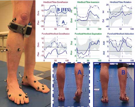 Eine Indikation zur Verwendung von FES ist eine Fußheberschwäche nach Schlaganfall, verursacht durch eine Schädigung von Nervenzellen des zentralen Nervensystems. FES aktiviert direkt den Nervus peroneus communis, um die Fußhebung wiederherzustellen. Dieser Nerv teilt sich im Bereich des Kniegelenks in den Nervus peroneus superficialis und den Nervus peroneus profundus. Der Nervus peroneus superficialis versorgt den Musculus peroneus longus und den Musculus peroneus brevis, die der Pronationsbewegung des Fußes dienen. Der Nervus peroneus profundus versorgt die zur Fußhebung benötigten Muskeln des Sprunggelenks wie z. B. den Musculus tibialis anterior und den Musculus extensor hallucis longus. Durch unterschiedliche mediolaterale Verschiebung der Elektroden in der Kniegegend (Abb. 6) oder mittels gezielter Implantation 21 lassen sich die beiden Nervenanteile Superficialis und Profundus in unterschiedlicher Intensität ansteuern, um den Fuß in der Schwungphase anzuheben und eine zusätzlich bestehende Fußdeformität, z. B. einen Klumpfuß wie in Abbildung 6 bei einem erwachsenen Patienten nach Schlaganfall, zu korrigieren. Wie in Abbildung 6 und in den Kurven des OFM dargestellt, wurde zwischen Rückfuß und Tibia die Dorsalflexion (Fußhebung) in der Schwungphase deutlich verbessert. Zudem wurde der initiale Fußaufsatz günstig beeinflusst und führte auch zu einer Änderung der Fußbewegung in der Standphase, in der eigentlich keine Stromaktivierung erfolgte. Durch verstärkte Aktivierung des Nervus peroneus superficialis wurde die Eversionsbewegung des Rückfußes stimuliert und die bestehende Rückfußinversion und Vorfußadduktion des Klumpfußes erheblich verringert. Somit hat die FES eine korrigierende Wirkung auf den Fuß, da sie durch die verbesserte Fußhebung das Durchschwingen erleichtert und beim Bodenaufsatz die Inversion und somit das Risiko eines Umknickens reduziert.