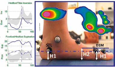 Bei dem jugendlichen Patienten in Abbildung 5 mit Knicksenkfuß besteht eine leicht erhöhte Eversion im Rückfuß von 10° in der Standphase. Der Vorfuß müsste zum Ausgleich der Eversion eine Verwringung (Supination) von ebenfalls 10° zeigen, damit der Fuß plantigrade aufliegt. Die Supination dominiert aber mit ca. 20° über die Rückfuß-Eversion und müsste daher zu einer Fußaußenrandbelastung führen. Die Druckverteilung desselben Patienten (Abb. 5) zeigt aber eine Innenrandbelastung, also besteht hier ein Widerspruch. Es liegt ein Fehler beim Palpieren des Markers D1M vor. Bei der Neutralstellung im aufrechten Stand sollten die Kugeln STL und D1M denselben vertikalen Abstand vom Boden aufweisen. In Abbildung 5 ist der Marker D1M ca. 5 mm zu hoch angebracht worden; in der Folge wird die Vorfuß zur Rückfuß-Supination (durchgezogene Linie) um ca. 10° überschätzt. Hier empfehlen die Autoren, die Plausibilität der Daten nochmals mit der plantaren Druckverteilung zu kontrollieren. Idealerweise können sie auf eine standardisierte Fotodokumentation zurückgreifen und im Falle eines Widerspruchs die Position der Marker in den Fotos des Fußes, die den aufrechten Stand zeigen, überprüfen.