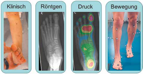 Während des Gehens hat der Fuß die Aufgabe, beim initialen Bodenkontakt den Aufprall zu dämpfen und sich danach in der Standphase an Unebenheiten des Bodens anzupassen, um eine sichere Auflagefläche zu gewährleisten. Beim nachfolgenden Abdruck sollte der Fuß einen steifen Hebel bilden, um die Kraft der Wadenmuskulatur effektiv zum Vortrieb zu nutzen 1. Sind diese Funktionen gestört, klagt der Patient häufig über Symptome wie rasche Ermüdung des Fußes, Schmerzen und Einschränkungen bei der Sportausübung. Zur Diagnostik der Fußfunktion für eine zielgerichtete Planung der Therapie mit Einlagen, Orthesen oder operativen Eingriffen haben sich Fußmodelle etabliert 2. Fußmodelle sind biomechanische Computermodelle zur Berechnung von Gelenkbewegungen im Fuß, basierend auf Kameraaufnahmen der Bewegung. Ein Fußmodell steht hierbei nicht alleine; es wird als sinnvolle Ergänzung der manuellen Tests von Beweglichkeit und Kraft, des Röntgenbildes und der dynamischen Druckverteilungsmessung angesehen, die in ihrer Zusammenschau bewertet werden (Abb. 1). Die Vorteile eines Fußmodells gegenüber den anderen drei Messmethoden liegen auf der Hand: Bei der Bewegung wirken oft höhere Kräfte, als der Untersucher im manuellen klinischen Test aufbringen kann. Im Gegensatz zum statischen Röntgenbild bildet eine dynamische Messung die Fehlstellungen bei Bewegung und deren muskuläre Kompensationen besser ab. Gegenüber der zweidimensionalen Druckverteilungsmessung stellt sie eine dreidimensionale Messung der komplexen mehrdimensionalen Fußbewegung dar.