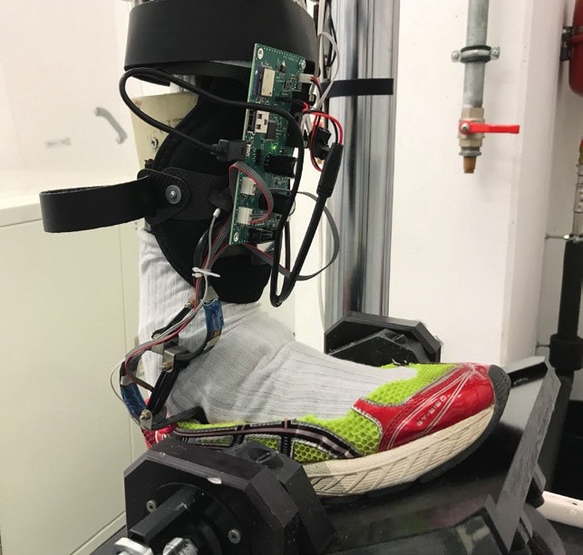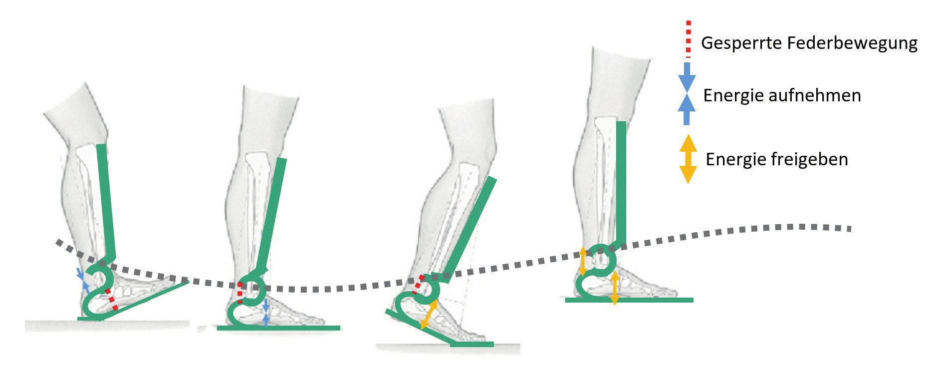 Mit Hilfe von Faserverbundmaterialien sollen Federstrukturen definierter Steifigkeit bzw. Elastizität ins Bauteil integriert werden. Die Federstrukturen der Orthese speichern die Bewegungsenergie in bestimmten Phasen des Gehens. Um die Bewegung zielgerichtet zu unterstützen, wird eine Aktorik eingesetzt, welche die Federenergie sensorgesteuert in den entsprechenden Gangphasen genau zum richtigen Zeitpunkt definiert freigibt (Abb. 1). Dies wird mit einem integrierten Schließmechanismus realisiert, der die elastisch vorgespannten Kompositstrukturen festhält und sie abhängig von der Gangphase gezielt wieder freigibt. Der Motor übernimmt somit lediglich eine Arretierungsfunktion und kann deshalb kompakt und leicht ausgeführt sein, da er nicht das Gewicht des Patienten inklusive der resultierenden Momente, sondern nur die Federspannung aufnehmen muss. Auf diese Weise lässt sich eine leichte, miniaturisierte und energieeffiziente Aktorik mit entsprechend kleinem Energiespeicher aufbauen. Es werden Drucksensoren in der Orthesensohle und Dehnmessstreifen an Federelementen in die Orthese integriert. Für Untersuchungen im Labor wird der Prototyp zusätzlich mit einem inertialen Messsystem (IMU) ausgestattet, das aus einer Kombination aus einem 3‑achsigen Beschleunigungssensor und einem 3‑achsigen Gyroskop besteht. Durch das Zusammenspiel verschiedener Sensordaten kann eine zuverlässige Erkennung der Gangphasen im Prototypen-Stadium erreicht werden.