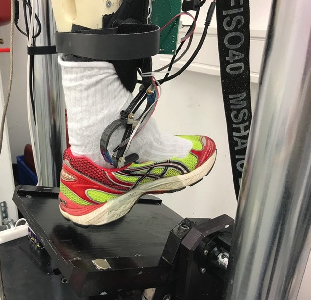Mit Hilfe einer modifizierten Prothesenprüfmaschine (KS 2–07, Shore Western, Monrovia, Kalifornien, USA), angelehnt an die Prüfnorm ISO 22675, wird das Verhalten verschiedener Entwicklungsmuster evaluiert (Abb. 2). Über ein künstliches Fußmodell wird der Orthesen-Prototyp aufgenommen. Anschließend wird der Prüfling über einen Hubzylinder in Kombination mit einem schwenkbaren Untergrund mechanisch mit einer Spitzenlast von 824 N und Winkeln zwischen ‑20° und +40° dynamisch und statisch belastet. Durch den Testaufbau können sowohl isolierte Bewegungen (beispielsweise initialer Fersenkontakt und Abstoßbewegungen) als auch der vollständige Abrollvorgang der Standphase abgebildet werden. Die Standphasendauer für den dynamischen Test beträgt 600 ms (Frequenz 1 Hz), was in etwa einer durchschnittlichen Standphasendauer beim normalen, gesunden Gehen entspricht.
