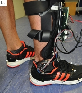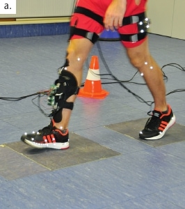 Ein erster Probandenversuch diente als Pilotversuch zur Funktionsüberprüfung der Sensorik (Abb. 3). Die Erfassung der kinematischen Daten erfolgte mit 14 IR-Kameras (Qualisys QTM, Qualisys AB, Göteborg, Schweden) und einem Markersetup mit passiv-reflektierenden Markern („LowerBody“-Marker-Set). Zusätzlich wurden die Bewegungsdaten der unteren Extremitäten mit dem System „Xsens Awinda“ (Xsens Technologies, Enschede, Niederlande) aufgezeichnet. Dies bietet die Möglichkeit, Rohdaten der IMU-Sensoren mit den Sensordaten des Orthesen-Prototyps zur vergleichen, was für die Algorithmen-Entwicklung und zur Validierung der Sensordaten genutzt wird. Die Bodenreaktionskräfte wurden mit vier Kraftmessplatten erfasst (AMTI-AccuGait). Der Versuch wurde auf einer ebenen Gangstrecke im Labor (maximale Länge 12 m, Bodenbelag Linodur) bei einem gesunden Probanden mit nichtpathologischem Gangbild durchgeführt. Der Proband trug dabei eine Unterschenkelorthese und simulierte verschiedene Gangmuster und Einschränkungen im Gangbild (Geschwindigkeit, Hinken, Timedup-and-go-Test). Die Daten wurden mit der Biomechanik-Software „Visual3D“ (C‑Motion, Germantown, Maryland, USA) zur Berechnung der Gangphasen-Parameter, der Gelenkwinkel und der Gelenkmomente der unteren Extremitäten verarbeitet und exportiert.