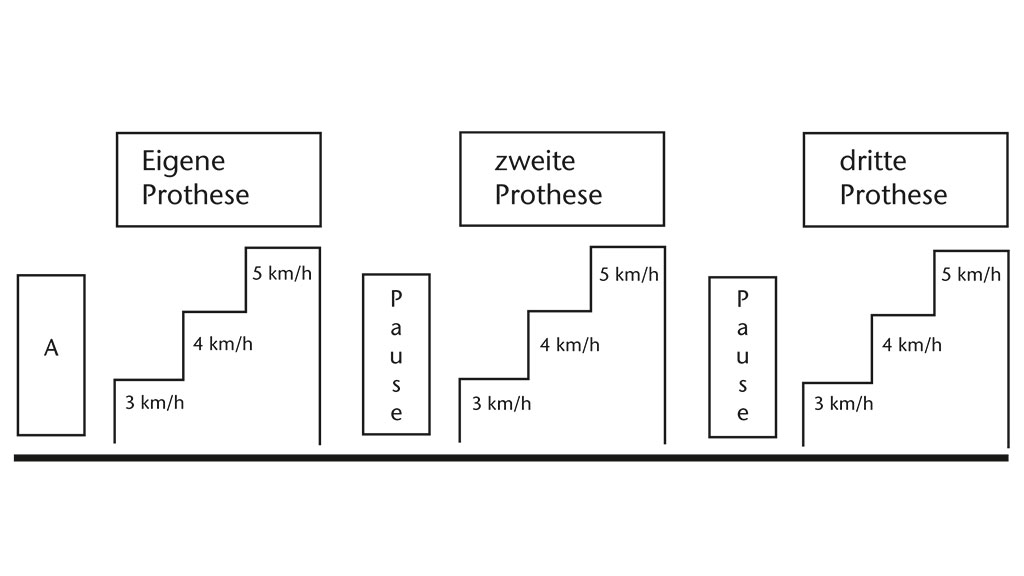 Die Messungen erfolgten im Rahmen eines dreistufigen Tests auf einem Woodway® Laufband (Abb. 1). Die Probanden sollten mit jeder der drei Prothesen mit 3 km/h, 4 km/h und 5 km/h für jeweils fünf Minuten gehen. Begonnen wurde mit der eigenen Prothese (C‑Leg). Die Zuordnung der Prothese zwei und drei (Rheo Knee 2, Kinegen 3A2000) erfolgte randomisiert mittels Losziehen. In der letzten Minute jeder Stufe wurden elektrophysiologische Signale der untersuchten Muskeln erfasst, da somit eine Eingewöhnungszeit berücksichtigt wurde. Die Sauerstoffaufnahme (VO2) wurde permanent mittels mobiler Spirometrie erfasst (Cortex Metamax 3B). Zwischen den einzelnen Stufentests mit den drei Prothesen hatten die Probanden eine erholende 45-minütige Pause. In dieser brachte ein Orthopädie-Techniker die neue Prothese an und stellte sie adäquat ein. Angebrachte Oberflächenelektroden wurden zwischen den Tests nicht entfernt.