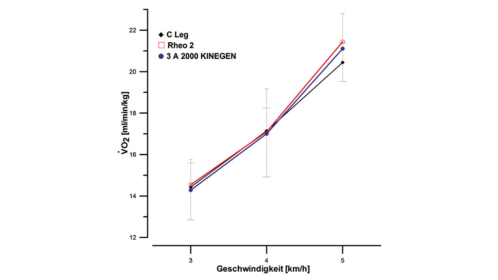Beim Rheo 2 stieg die Aktivität des M. glut. max. in der Standphase von 3 auf 5 km/h signifikant an. Der M. rectus fem. zeigte eine signifikante Zunahme der Aktivität über die Geschwindigkeitsstufen (p<0,05). Für den M. obliquus externus abdominis konnte auf der nicht betroffenen Körperseite dies beim C‑Leg und Kinegen in der Standbeinphase beobachtet werden. Beim Rheo Knee 2 wurden diese Aktivitätserhöhungen des M. obliquus externus abdominis bei fünf km/h auf der Amputationsseite in der Schwungbeinphase festgestellt. Eine deutliche Zunahme zeigte sich im relativen Sauerstoffverbrauch (p<0,05) (Abb. 2).