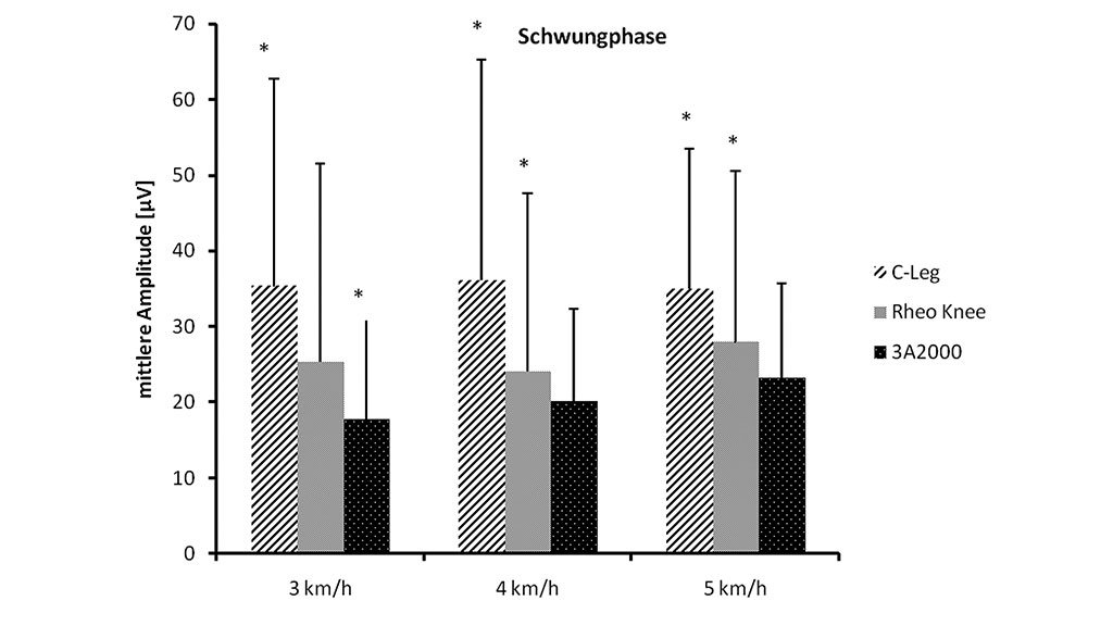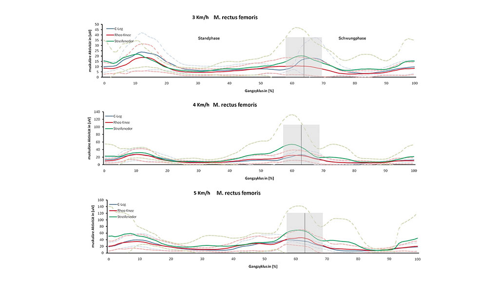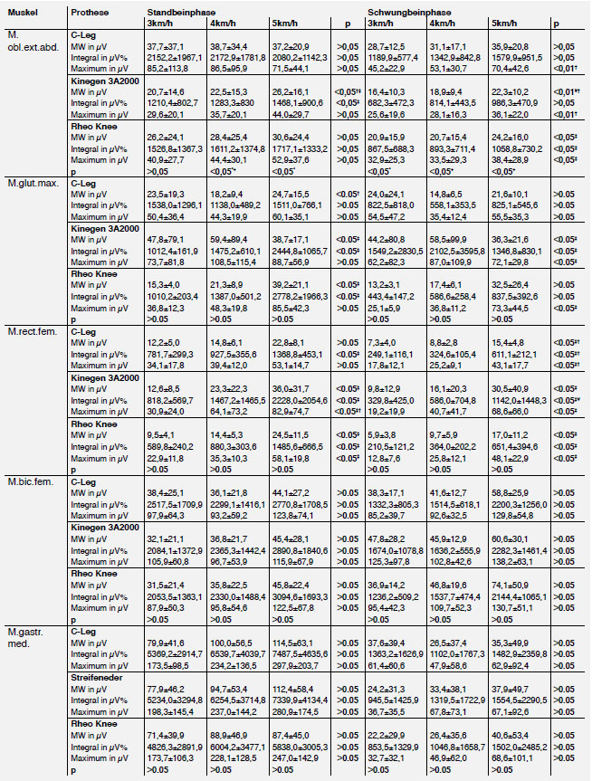 Alle Ergebnisse wurden in Tabelle 1 in Abhängigkeit der Gehgeschwindigkeit und Prothese dargestellt (Tab. 1). Die Geschwindigkeit zeigte einen signifikanten Effekt auf die Aktivität des M. oblic. ext. abd., M. gluteus max. und M. rectus femoris (p<0,05). Es kam mit steigender Geschwindigkeit zu einer kontinuierlichen Zunahme der Muskelaktivität, welche bei den anderen Muskeln nur tendenziell war (M. biceps fem., M. gastrocn. med.). Jedoch zeigte sich beim M. gluteus maximus zwischen den Geschwindigkeiten ein heterogenes Muster. Es wurde beobachtet, dass beim Kinegen die Aktivität bei Geschwindigkeitsänderung von 3 auf 4 km/h tendenziell zunahm und zu 5 km/h wieder abnahm. Hingegen sank die Aktivität dieses Muskels von 3 auf 4 km/h, um dann signifikant bei 5 km/h in der Schwungphase sich zu erhöhen.