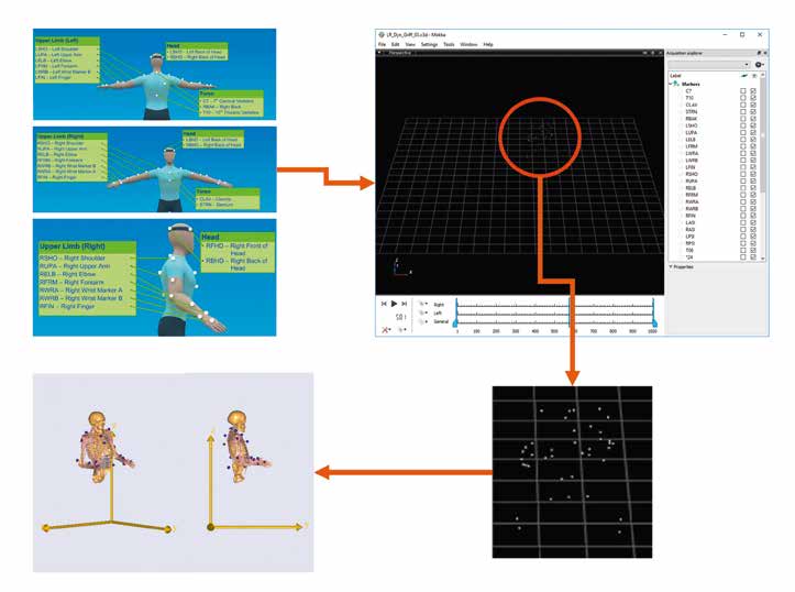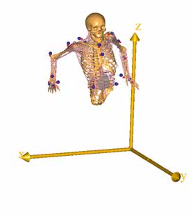 Diese Bewegungsdaten standen anschließend für die biomechanische Modellierung zur Verfügung. Für die weitere Auswertung wurden aus zeitlichen Gründen lediglich die Bewegungsdaten der Probanden JB, LR und MK herangezogen. Die anhand der Bewegungsanalyse zur Verfügung stehenden Daten (als C3D-Dateien) der einzelnen Marker wurden in Bezug auf Markerbenennung und ‑position vereinheitlicht. Die resultierenden Bewegungsinformationen wurden in einem zweiten Schritt wiederum in die Mehrkörper-Simulationsumgebung „AnyBody“ (Version 6.0, AnyBody Technology A/S, Aalborg, Dänemark) überführt (Abb. 2). Damit wurde ein Modell konzipiert, das mit Hilfe der akquirierten Marker-Daten aus der Bewegungsanalyse angetrieben werden kann. Das Modell besteht aus der oberen Körperhälfte inklusive der Beckenregion (Abb. 3). Die untere Extremität (rechtes und linkes Bein) wurde zwecks zeiteffizienterer Simulation ausgeblendet. Bei dem Modell handelte es sich um ein bereits vorhandenes und etabliertes Modell aus der Datenbank der AnyBody-Software 19.