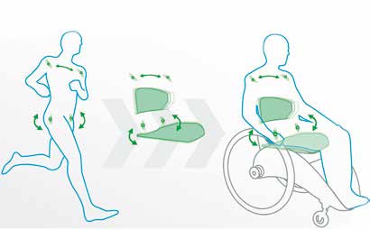 Grundlage für die Untersuchung war eine Bewegungsanalyse mit insgesamt 9 Probanden. Bei den Probanden handelte es sich um gesunde Freiwillige, die den jeweiligen Bewegungstest absolvierten. Anhand der Benutzung eines herkömmlichen Greifreifen-Rollstuhls sowie eines neuartigen Modells, das mit einem Hebelantrieb und einer mobilen Sitzfläche ausgestattet war, wurden die für die biomechanische Modellierung benötigten Bewegungsinformationen akquiriert. Die mobile Sitzfläche erlaubte eine Bewegung um eine zentrale, in der Mitte der Sitzfläche gelegene Längsachse; zusätzlich ist eine Verkippung der Rückenlehne um eine von vorne nach hinten gerichtete Achse möglich. Der Hebelantrieb überträgt einen natürlichen Bewegungsablauf auf die dynamische Sitzfläche, wodurch Wirbelsäule, Muskulatur und das lymphatische System mobilisiert werden (Abb. 1).