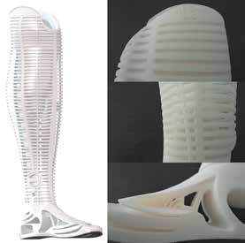 Bereits 2004 präsentierte M. C. Faustini Prothesenschaftkonstruktionen, die im SLS-Verfahren hergestellt wurden. Die Schäfte wiesen konstruktiv gestaltete flexible Areale zur Druckentlastung auf 5. Ein Vergleich von Carbonfaserfüßen und gesinterten Prothesenfüßen zeigte, dass beide Fußpassteile zunächst ein ähnlich steifes Verhalten aufweisen 6.