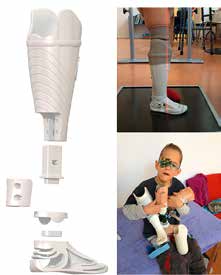 Auch in der Orthetik hat die generative Fertigung Vorteile 10 11. Neben den neuen Gestaltungsmöglichkeiten des Oberflächendesigns, welches auch hier durchaus die Akzeptanz des Hilfsmittels steigert, können wirtschaftliche Stecksysteme für Orthesen hergestellt werden, ohne auf die gewünschte individuelle Passform verzichten zu müssen (Abb. 7). Die patientenspezifischen Orthesenschalen werden individuell nach Körpermaßen oder anhand des Patientenpositivs hergestellt. Vorkonfektionierte Bauteile wie Carbonfedern und Leichtmetallgelenke verbinden dann die Schalen zu einer kompletten Orthese. Häufig ist eine gewisse Flexibilität der Orthese an den Laschen unabdingbar, während andere Areale steif gestaltet sein sollten, um eine maximale Führung mit der Orthese zu gewährleisten. Die daraus resultierende Wandstärkendifferenz und die Flexibilität von sehr dünnwandigen Arealen gepaart mit einer gesunden Rücksichtslosigkeit von Kindern scheint zurzeit eine große Herausforderung bei der Fertigung im SLS-Verfahren zu sein.