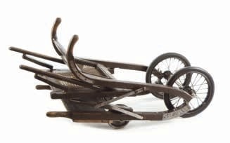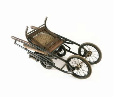 Das ältere Modell, ca. 1904 gefertigt, ist ein Tragerollstuhl der Firma Voltmann aus Bad Oeynhausen. Die Holzkonstruktion aus Buche ist dem Kutschenbau entlehnt, aber mit 28 Scharniergelenken so konstruiert, dass der schwere Tragestuhl auch zusammengefaltet werden kann. Der Holzrahmen des Fahrgestells weist zwei Bruchstellen auf, die mit Eisenbeschlägen stabilisiert wurden. Diese Metallverstärkungen erhöhen das Gewicht des Stuhls auf 30 kg.