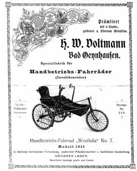 Die Firma Voltmann bestand seit 1871 wahrscheinlich als Schlosserei, wobei der Schlossermeister Voltmann vermutlich angesichts der Invaliden des Deutsch-Französischen Krieges 1870/71 mit der Konstruktion von Rollstühlen begann (Abb. 2). Zwei Söhne traten in die Fußstapfen des Vaters; der älteste Sohn, Wilhelm, gründete 1901 einen eigenen Betrieb, der zweitälteste, Hermann, übernahm den väterlichen Betrieb. Bereits um 1903 galt Bad Oeynhausen als rollstuhlgerechte Kurstadt mit den ersten verfügbaren Selbstfahrern.