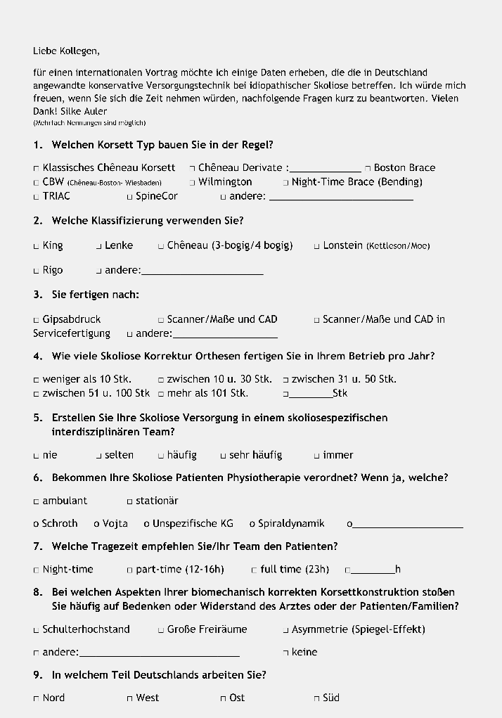 Zunächst wurde eine Literatursuche in den Datenbanken PubMed und Scoliosis Journal sowie in deutschen Fachzeitschriften mit folgenden Suchbegriffen (englisch und deutsch) durchgeführt: “Idiopathische Skoliose UND Korsett”. Die Suche wurde eingegrenzt auf Beiträge aus Deutschland, die nicht älter als fünf Jahre sind. Ein informeller Fragebogen wurde an solche orthopädietechnischen Betriebe geschickt, von denen der Autorin bekannt war, dass sie an der Korsettversorgung von Skoliosepatienten beteiligt sind. Die Fragen zielten auf den verwendeten Korsett-Typ, die Klassifizierung und die Herstellungsart. Des Weiteren sollten Angaben zur interdisziplinären Zusammenarbeit gemacht und die häufigsten Gründe bzw. Probleme benannt werden, die die Akzeptanz des Korsetts erschweren. Dabei waren mehrere Einträge möglich.
