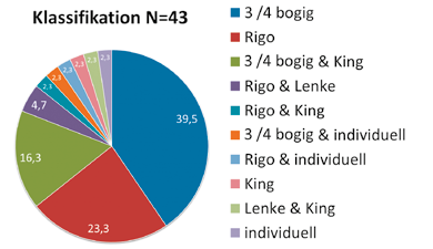Das Krümmungsmuster klassifizieren 40 % der Befragten ausschließlich als 3-/4‑bogig, 23 % nach Rigo 20 und jeweils 2 % nach King bzw. individuell nach eigener Einteilung. Verschiedenste Kombinationen der vorgenannten Klassifikationen miteinander, aber auch mit Lenke wurden angegeben (Abb. 3).