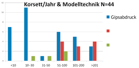Die Hälfte der Befragten gab an, mehr als 50 Versorgungen pro Jahr vorzunehmen, 6 davon sprachen von mehr als 250 Korsetten pro Jahr. Dabei ist der Gipsabdruck mit nachfolgender manueller Modelltechnik vorherrschend in solchen Werkstätten, die weniger als 50 Korsette pro Jahr fertigen. Nur zwei von diesen 24 Betrieben nutzen eine Servicefertigung. Sechs Betriebe, deren Stückzahlen deutlich mehr als 100, nämlich bis zu 350 betragen, gaben an, weiterhin mit Gipsabdruck zu arbeiten, davon nutzen zwei Betriebe zusätzlich ein eigenes CAD-CAM-System. Einrichtungen, die über ein betriebseigenes CAD-CAM-System mit eigener digitaler Modellbibliothek verfügen und Servicefertigung anbieten, machten den Hauptanteil der Versorgungen in Deutschland aus (bis zu 1700 Korsette pro Jahr). Der Zusammenhang zwischen Versorgungszahl und Modelltechnik wird in Abbildung 4 sichtbar.