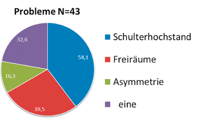 Probleme mit der Akzeptanz des Korsetts bei den Patienten selbst, deren Eltern und/oder Ärzten sahen 55 % der Befragten durch den korsettinduzierten Schulterhochstand und 38 % durch große Freiräume hervorgerufen, während Asymmetrie der Haltung im Korsett nur von 16 % als kritisch betrachtet wird. Ein Drittel der Befragten berichtete, gar keine Probleme mit der Akzeptanz ihrer Korsette zu haben (Abb. 5).
