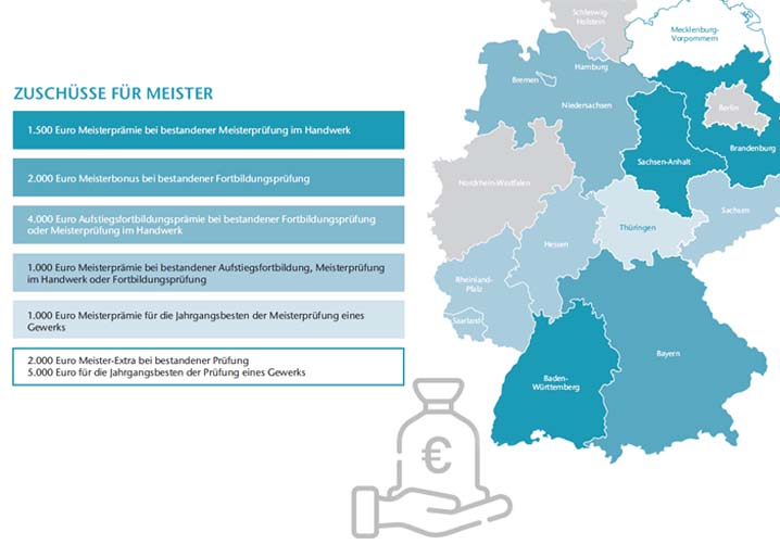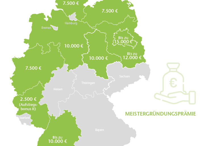 Wer seine Meisterprüfung besteht, der kann sich in fast allen Bundesländern über eine einmalige Zahlung von mindestens 1.000 Euro freuen. Dafür muss allerdings zunächst ein Antrag gestellt werden. In Thüringen gilt zudem die Besonderheit, dass nur die oder der Jahrgangsbeste pro Gewerk eine Meisterprämie erhält. Lediglich Berlin, Nordrhein-Westfalen und Schleswig-Holstein setzen auf ein anderes Konzept und unterstützen Meister mit ihrer Meistergründungsprämie für eine Neugründung bzw. eine Übernahme eines Betriebs.