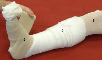 Um den für eine effektive Kompressionstherapie notwendigen gleichmäßig zirkulären Druckverlauf zu erreichen und Hautschäden zu vermeiden, müssen Knochenvorsprünge abgepolstert, Vertiefungen aufgefüllt und ein gleichmäßig runder Querschnitt der Extremität hergestellt werden. Dies kann mit Hilfe einer Unterpolsterung, für die Vertiefungen ggf. zuzüglich mit Pelotten (Schaumstoffpolstern), bewerkstelligt werden (Abb. 4 u. 5) (siehe auch unten zum Mehrlagenkompressionsverband).