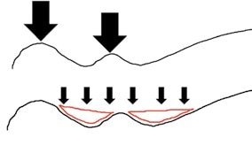 Anwendung findet Laplace auch beim Extremitätenumfang. Grundlage einer effektiven Kompressionstherapie ist per definitionem eine zirkulär gleichmäßige Druckverteilung. Diese Bedingung ist nicht so leicht zu erfüllen, da beispielsweise die Tibiakante am Unterschenkel einen sehr kleinen Radius darstellt, der Wadenbereich hingegen einen großen (Abb. 3 u. 4) Das bedeutet, dass auf die Tibiakante ein höherer Druck wirkt als auf den Wadenbereich. Ebenso verhindern im Fesselbereich die Knöchel (Malleolen) und die Hohlkehlen um die Knöchel (Bisgaard’sche Kulisse) einen gleichmäßigen Druckverlauf (Abb. 5). Hohe Drücke auf kleinen Radien können außerdem zu Hautschäden führen, die das Infektionsrisiko erhöhen und die Therapie erschweren (Abb. 6).
