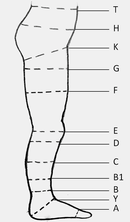 Maßstrümpfe werden individuell nach Beinumfang und ‑länge angefertigt 25. Serienstrümpfe werden in Standardgrößen hergestellt. Ihre Umfangs- und Längenmaße orientieren sich an festgelegten Messstellen (A–T) (Abb. 9) 26. Sie werden in vier Ausführungen angeboten: