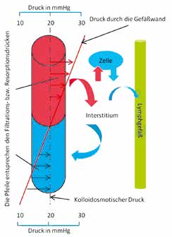 Filtration und Resorption werden über unterschiedlich hohe Drücke im arteriellen und venösen Teil der Kapillare sowie über den durch die Bluteiweiße erzeugten kolloidosmotischen Druck geregelt. Laut gängiger Lehrmeinung ist der von außen auf das Kapillargefäß wirkende und von den Bluteiweißen erzeugte kolloidosmotische Druck mit ca. 20 mmHg weitgehend konstant, während der Blutdruck im Kapillargefäß vom arteriellen Teil mit ca. 30 mmHg zum venösen Teil mit ca. 10 mmHg stark abnimmt (Abb. 1). Die Gefäßwand der Kapillare wirkt dabei wie ein Sieb, welches nur für Flüssigkeiten und Stoffe einer bestimmten Größe durchlässig ist. Einige der Abfallprodukte im Gewebe sind zu groß, um durch die Gefäßwand der Kapilare ins venöse Blut zu gelangen. Die Aufnahme dieser Abfallprodukte und Flüssigkeit erfolgt durch die initialen Lymphgefäße. Physiologisch werden in 24 Stunden ca. 20 l Flüssigkeit und Nährstoffe filtriert, 18 l Flüssigkeit und Abfallprodukte in die Blutkapillare resorbiert und ca. 2 l große Abfallprodukte und Flüssigkeit vom Lymphgefäßsystem aufgenommen. Das so entstehende Flüssigkeitsgleichgewicht wird auch Starling’sches Gleichgewicht genannt 5.