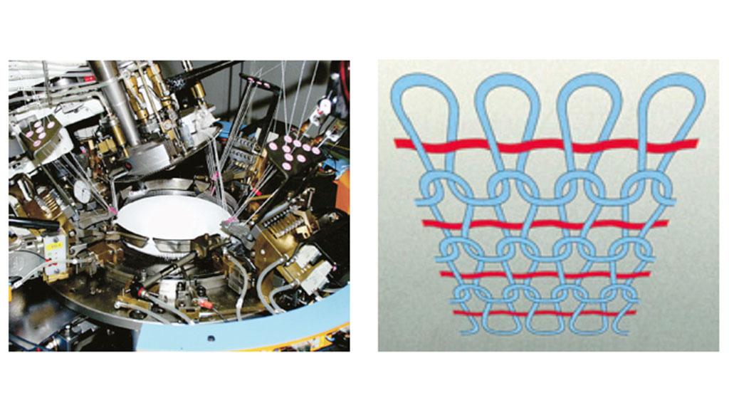 Rundgestrickte Kompressionsstrümpfe werden auf einem Zylinder gestrickt, dessen Nadeln in einer Runde angeordnet sind. Da die Nadelzahl im Strickzylinder konstant ist, kann auch die Maschenzahl im Strumpfumfang nicht verändert werden. Die Anpassung an die Beinform erfolgt in erster Linie durch die unterschiedliche Vordehnung des im Strumpf spiralförmig verlaufenden elastischen Einlegefadens sowie durch die Veränderung der Maschenhöhe (von distal – kleine Maschen – zu proximal – größere Maschen). Auf diese Weise werden das notwendige Druckgefälle von distal nach proximal sowie die Formgebung des Strumpfes erreicht. Der medizinisch wirksame Kompressionsdruck wird durch Art und Stärke des Einlegefadens wie auch der maschenbildenden Fäden bestimmt. Das Rundstrickverfahren eignet sich in erster Linie für venöse Erkrankungen und zeichnet sich durch feine und dünne Materialien aus (Abb. 3a u. b).