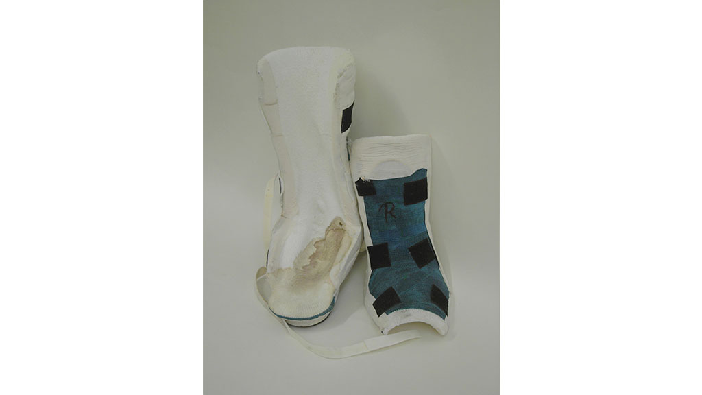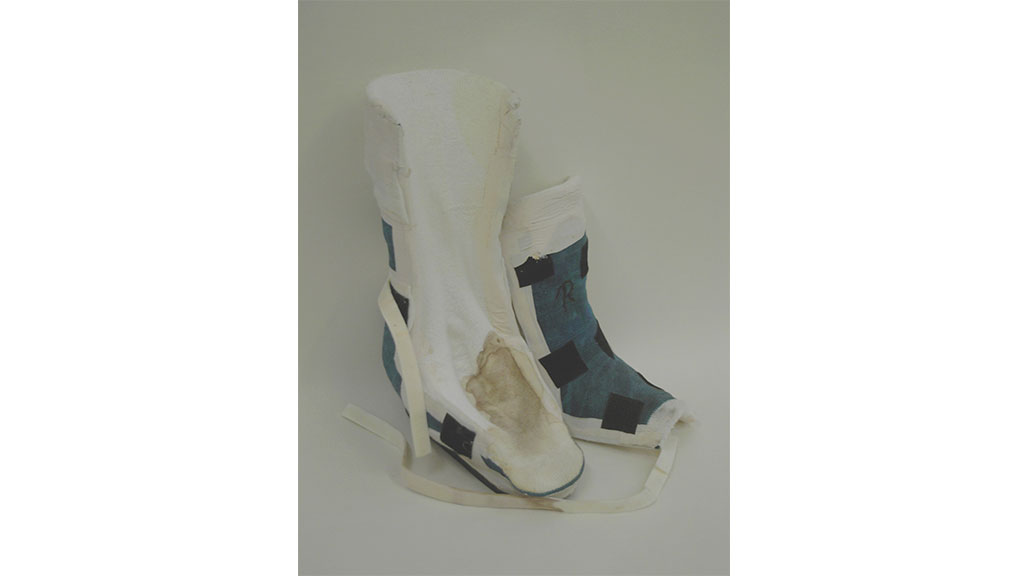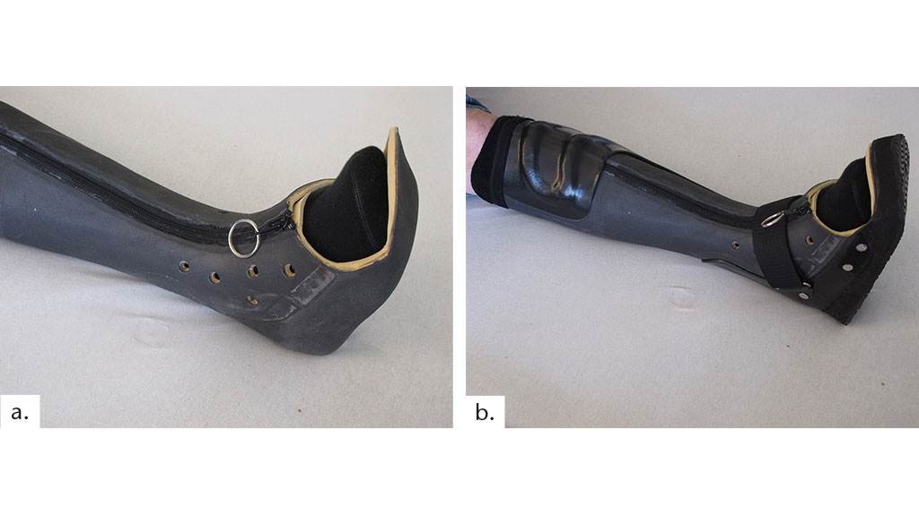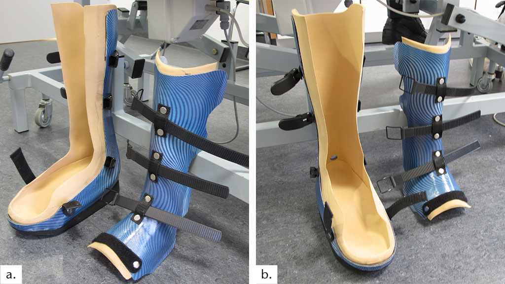 2‑Scha­len-Orthe­sen (2SO) wer­den indi­vi­du­ell über einem nach Gips­ab­druck her­ge­stell­ten Modell ange­fer­tigt. Die Scha­len über­lap­pen und ermög­li­chen eine Anpas­sung an Volu­men­ver­än­de­run­gen (Abb. 2a u. b). Eine inf­rapa­tel­la­re Abstüt­zung (Sar­mi­en­to-Tech­nik) kann ein­ge­baut wer­den. Prin­zi­pi­ell dient die 2SO der rigi­den Fixie­rung des Fußes in einer vor­ge­ge­be­nen Posi­ti­on und soll über einen Zeit­raum von meh­re­ren Mona­ten getra­gen wer­den. Durch die zwei Scha­len ist ein zwei­ma­li­ger Gieß­vor­gang bei der Her­stel­lung erforderlich.