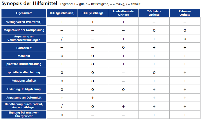 Alle hier vor­ge­stell­ten Orthe­sen und Casts umfas­sen den Fuß und den Unter­schen­kel bis hin­auf zur Tube­ro­si­tas tibiae. Nicht vor­ge­stellt wer­den in die­ser Über­sicht Ober­schen­kel-Orthe­sen mit oder ohne Tuber­auf­sitz, Tho­mas-Splint, All­gö­wer-Appa­rat oder Rück­fuß-Ent­las­tungs-Orthe­se (nach Sett­ner-Münch), da all die­se Pro­duk­te mit ihrem Prin­zip der voll­stän­di­gen Ent­las­tung des gesam­ten oder des hin­te­ren Fußes weder zur The­ra­pie des Ulcus noch der Neu­ro­ar­th­ro­pa­thie benö­tigt wer­den. In ihrer Risi­ko-Nut­zen-Bewer­tung und oft auch hin­sicht­lich der Wirt­schaft­lich­keit schnei­den sie aus Sicht der Autoren schlech­ter ab als die oben auf­ge­führ­ten Orthe­sen. Grund­sätz­lich soll­te bei der ja übli­chen Lang­zeit­nut­zung eine Schu­her­hö­hung für die Gegen­sei­te mit ver­ord­net wer­den und vom ver­ord­nen­den Arzt sowie vom Ortho­pä­die-Tech­ni­ker auf Gang- und Stand­si­cher­heit sowie auf zuver­läs­si­gen Ein­satz und Anla­ge des Hilfs­mit­tels geach­tet werden.