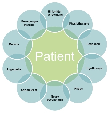Die Deutsche Gesellschaft für Neurologie hat in diesem Zusammenhang bereits 2012 in ihren Leitlinien festgehalten: „Das multidisziplinäre Vorgehen ist dadurch charakterisiert, dass jeder Teilnehmer sich darauf beschränkt, die Entwicklung des Rehabilitanden – und die daraus resultierenden weiteren Behandlungsschritte – aus der Sicht seines eigenen Fachgebietes darzustellen“ 8. Abbildung 5 zeigt schematisch die Zusammensetzung eines multiprofessionellen Teams in der Neurorehabilitation auf und veranschaulicht die Notwendigkeit der Zusammenarbeit.