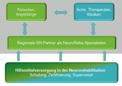 Was passiert jedoch, wenn der Patient plötzlich „austherapiert“ ist und keinerlei ärztliche Verordnungen für Heil- oder Hilfsmittel mehr erhält? Eine Vielzahl von Patienten unterschiedlichster Indikationen fällt an dieser Stelle durch das Nachsorgeraster. Eine solide Konstante im weiteren Reha-Verlauf ist die Versorgung mit Hilfsmitteln im spezialisierten Sanitätshaus. Dieses kann somit als Basis für die Bildung regionaler Netzwerke dienen und im Austausch mit Patienten und Angehörigen einerseits sowie Ärzten und Therapeuten andererseits innerhalb einer fundierten Beratung und Versorgung für eine optimale Hilfsmittelunterstützung verantwortlich zeichnen. Angesichts immer komplexerer und erklärungsbedürftigerer Hilfsmittellösungen ist eine auf das Indikationsfeld zugeschnittene Fortbildung, Unterstützung vor Ort und ggf. Supervision ein Instrument, das beim Aufbau regionaler Netzwerke sinnvoll eingesetzt werden sollte (Abb. 7), um den Patienten indikations- und zielgruppenspezifisch in einem multiprofessionellen Setting versorgen zu können (Abb. 8). Mit Hilfe regionaler Netzwerke können die Strukturmerkmale der multidisziplinären Neurorehabilitation in einem Maße verändert werden, wie es seinerzeit in der Akutneurologie durch die Einführung der Stroke Units erfolgte. Seit es diese spezialisierten Institutionen gibt, greift eine nachhaltige Verbesserung der Prozessqualität in der Routineversorgung. Gleiches gilt es nun in der Nachsorge zu realisieren, zumal die Umsetzung der wissenschaftlichen Forderung nach adäquaten Kompetenznetzen und Versorgungen infolge zunehmender neurologischer Erkrankungen nicht neu ist und von Versorgungsforschern bereits seit Langem gefordert wird 20.