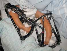 - Im Oktober 2009 erfolgt die Erstvorstellung im Universitätsklinikum Münster, im März 2010 die operative Distraktion, Redression und Rekonstruktion der Deformitäten mit externen Fixateuren (Abb. 5a). Die Fixateure werden über ein halbes Jahr in zwei Phasen à drei Monaten mit täglichem Redressment angepasst.