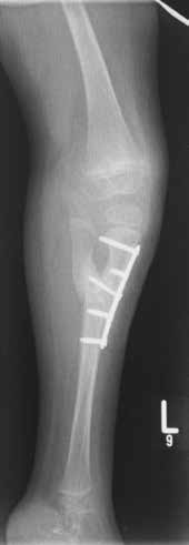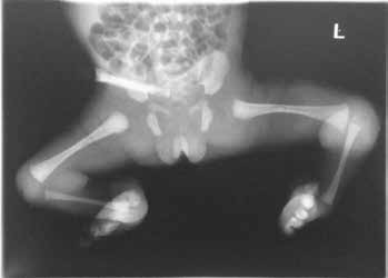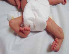 Pränatal wird bei der Patientin im Ultraschall eine beidseitige Fehlbildung der unteren Extremität diagnostiziert. Die Patientin kommt per Sectio in der 31. SSW als Frühgeborenes (Abb. 4a) zur Welt. Das Krankheitsbild präsentiert sich nach der Geburt als beidseitige Tibiaaplasie, rechts Grad 1, links Grad 2a (Abb. 4b). Rechtsseitig besteht eine Kniebeugekontraktur von 110°. Die Patellaaplasie zieht einen fehlenden Muskelstreckapparat nach sich, der Fuß steht in Inversion und Klumpfußstellung, die Großzehe ist hypoplastisch. Linksseitig ist das Kniegelenk frei beweglich. Patella und Streckapparat sind vorhanden, ein Tibiaplateau ist erkennund tastbar. Der linke Fuß steht ebenfalls in Inversions- und Klumpfußstellung. Ein Herzfehler und das sehr niedrige Geburtsgewicht machen zunächst einen mehrwöchigen stationären Aufenthalt notwendig.