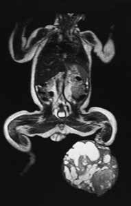 In der Woche vor dem Geburtstermin kommt im Rahmen einer sonographischen Untersuchung des Patienten der Verdacht auf ein Steißbeinteratom der Mutter mit Differentialdiagnose Plazentatumor (Rhabdomyosarkom) auf. Perinatal erweist sich dies jedoch als Weichteilsarkom des Unterschenkels des Patienten. In der Folge wird der Patient an seinem zweiten Lebenstag linksseitig transtibial amputiert (Abb. 7c). Im weiteren Verlauf erhält er teilstationär Chemotherapie.