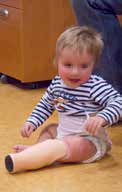 - erste Prothesenversorgung im Alter von 9 Monaten zum Krabbeln (Abb. 8 a u. b); kein Prothesenfuß, um das Verdrehen im Kniegelenk zu vermeiden