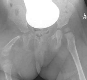 - längsovaler OS-Ringschaft mit annähernder Umgreifung des Tuber ischiadicum (Kind trägt Windeln) und Weichteileinfassung unter Anstützung der Glutäen