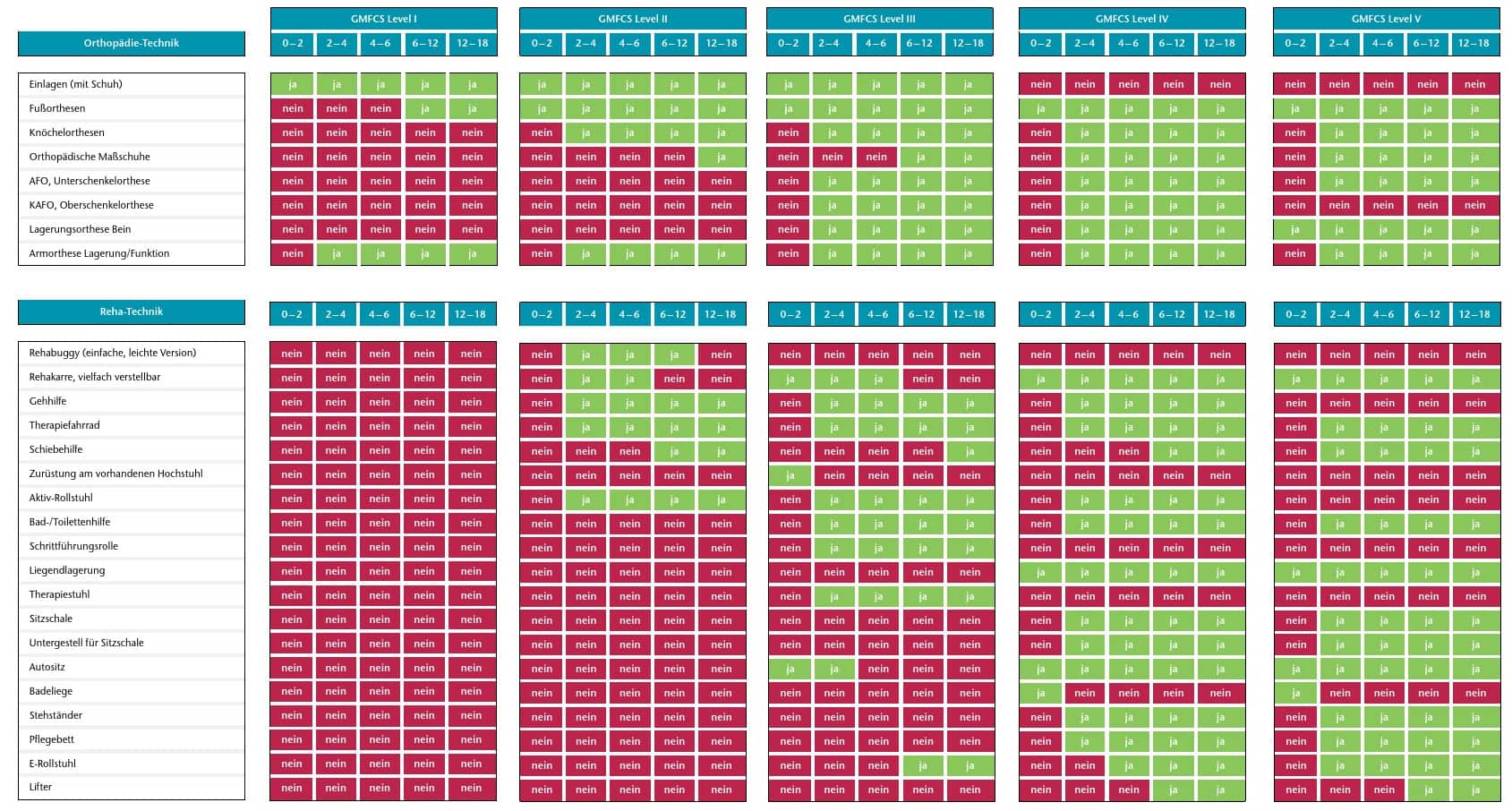 Der Erfolg der vorgestellten Matrix hängt unter anderem davon ab, dass sie in einer Sprechstunde auch tatsächlich genutzt wird. Dafür muss sie möglichst einfach und auch kompakt sein. Zu diesem Zweck wurde aus den fünf einzelnen Tabellen (Beispiele Tab. 2 u. 3) eine Gesamtübersicht (Abb. 1) erarbeitet. Diese kann im DIN-A4-Querformat ausgedruckt werden und ist somit in jedem Setting immer schnell greifbar. In den waagerechten Zeilen sind jeweils die Hilfsmittel aufgeführt, in den senkrechten Spalten die GMFCS-Level 1 bis 5, jeweils unterteilt in die fünf Altersgruppen. Mit zunehmender Einschränkung der Mobilität und Funktionalität als Erscheinungsbild der Cerebralparese steigt der Bedarf an Orthesen und Reha-Hilfsmitteln. In der Gesamtübersicht (Abb. 1) lässt sich dies anhand der grafischen Darstellung (rot bzw. grün markiert) einfach ablesen. Links beginnt die Matrix mit GMFCS-Stufe 1 und entwickelt sich nach rechts hin bis zur Stufe 5. Somit steigt von links nach rechts die Notwendigkeit von Hilfsmitteln und somit die Anzahl grüner Felder. Zusätzlich zur farbigen Markierung ist im jeweiligen Feld entweder „ja“ oder „nein“ angegeben, um Fehlinterpretationen zu vermeiden.