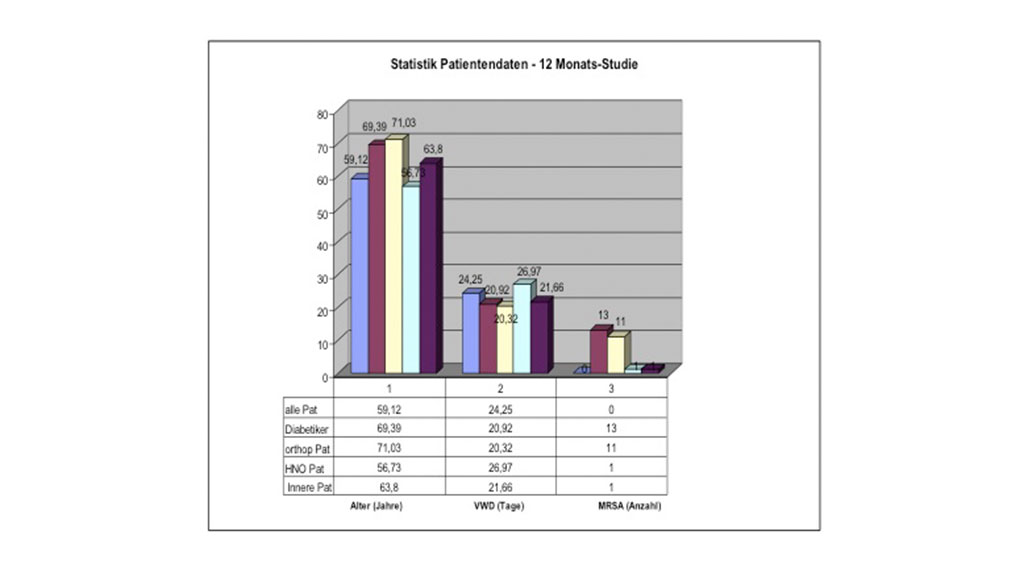 Im Durchschnitt waren die Patienten 59,12 Jahre alt, in den Abteilungen HNO 56,73 Jahre, Innere Medizin 63,80 Jahre und Orthopädie 71,03 Jahre. Das Durchschnittsalter der Diabetiker lag bei 69,39 Jahren über alle Indikationen. Bei 569 Diabetikern erreichte die Screeningrate 100 %. Die Anzahl MRSA kam bei insgesamt 17 Diabetikern vor (2,98 % oder 0,46 % der Gesamtpopulation).