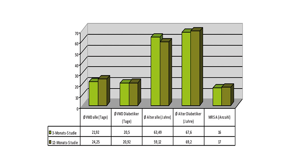 Zum Zeitpunkt der Aufnahme lag bei 13 Diabetikern (2,28 %) eine MRSA-Besiedlung vor, das sind 0,35 % aller stationär behandelten Rehabilitanden. Elf Patienten (1,93 %) hatten eine orthopädische Grunderkrankung – vier Patienten (0,70 %) wurden wegen eines Diabetischen Fußsyndroms an der unteren Extremität amputiert (zwei Oberschenkel‑, zwei Unterschenkelamputationen). Je ein Patient wurde wegen Erkrankungen auf dem Gebiet der Inneren Medizin sowie auf dem Gebiet der HNO rehabilitiert.