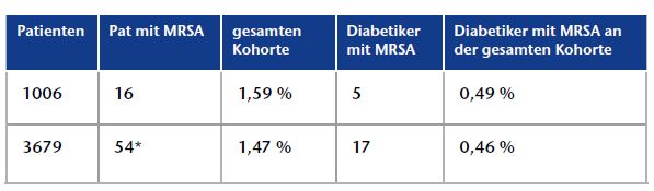In der Ein-Jahres-Studie konnte eine Prävalenz für MRSA bei Diabetikern von 2,98 % ermittelt werden. Damit ist das Risiko eines Patienten mit Diabetes mellitus für eine MRSA-Besiedelung um 2,38-fach höher als bei Nicht-Diabetikern.