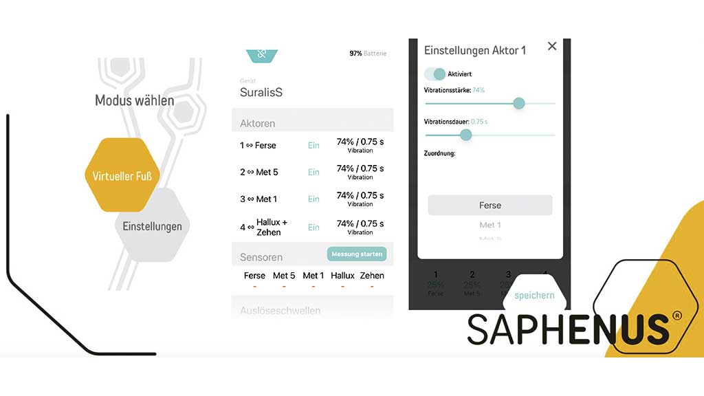 Die Vibrationsaktuatoren schwingen mit einer Amplitude von 60–120 Hz und die Latenzzeit zwischen Bodenkontakt und Auslösung der Vibration beträgt weniger als 100 ms. Die Vibrationsstärke, ‑dauer und Schwellenwerte für eine Stimulation können über eine App angepasst werden (Abb. 2).
