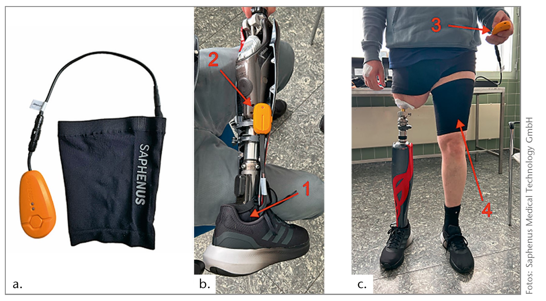 Die Probeversorgung dient dazu, dass der Patient das System nicht-invasiv und ohne eine Anpassung des Schaftsystems – dies würde eine Kostenübernahme durch den Kostenträger erfordern – austesten kann. Hierfür wird eine elastische Bandage verwendet. Diese Bandage beinhaltet die vier Vibrationsaktuatoren, die in einer Reihe von oben nach unten eingebettet sind; sie kann über den Amputationsstumpf als Oberschenkel-Beinmanschette getragen werden (Abb. 3). Bei transtibial Amputierten kann die Manschette am gleichseitigen Oberschenkel getragen werden, bei transfemoralen Patienten wird die Beinmanschette an der kontralateralen gesunden Seite angebracht. Das System wird dann entsprechend umprogrammiert, sodass eine Druckdetektion am Vor- und Rückfuß der amputierten Seite antizyklisch zur Stimulation des kontralateralen, gesunden Oberschenkels führt.