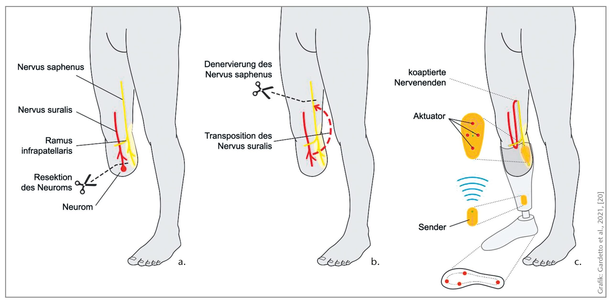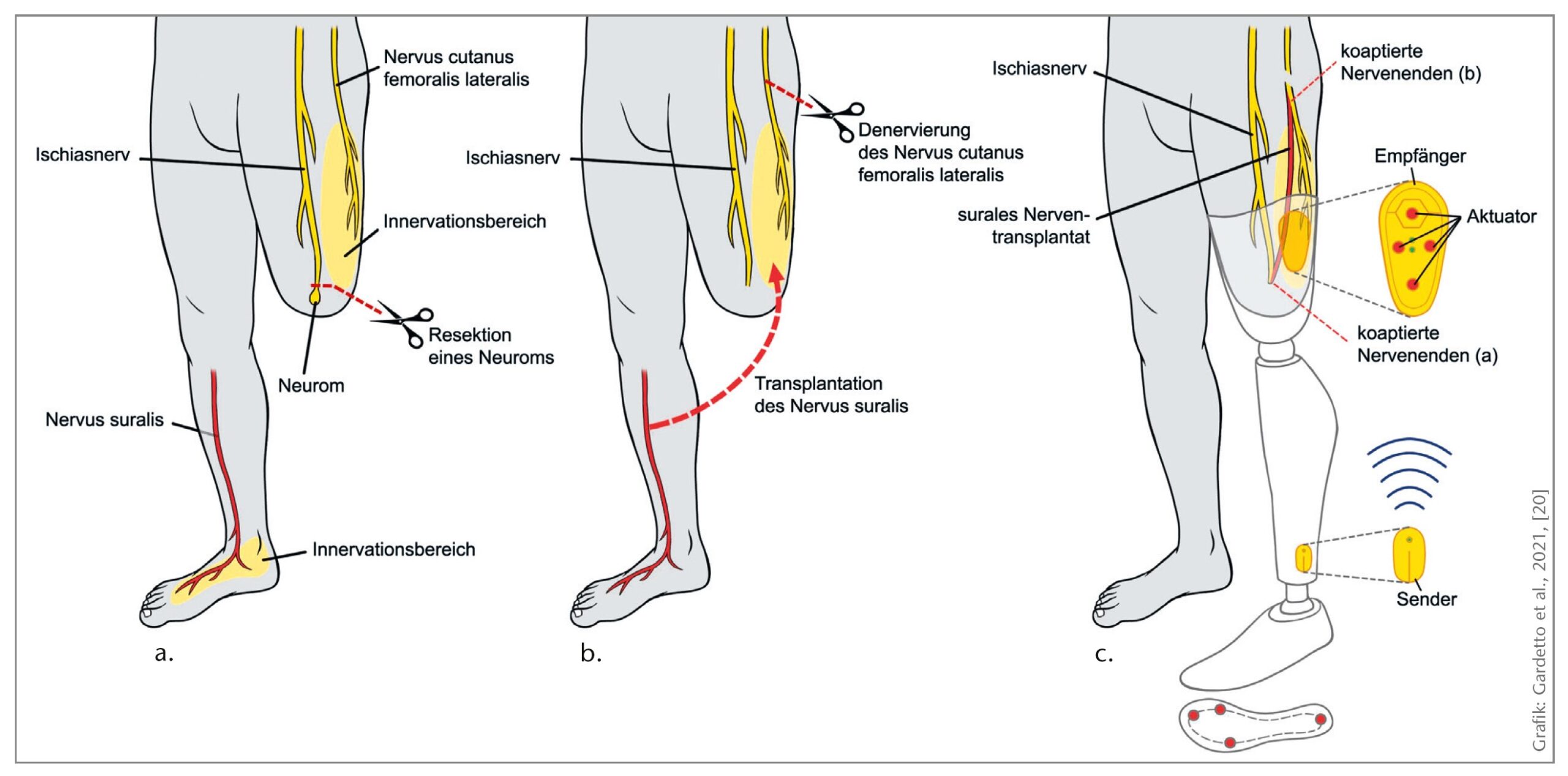Bei einer Amputation des Beines auf Höhe des Unterschenkels dient meist der Nervus suralis, der den lateralen Fußrand und die Ferse sensibel innerviert, als Spendernerv, um die Sensibilität der Fußsohle wiederherzustellen, und der Nervus saphenus, der die Haut des medialen Oberschenkels innerviert, als Empfängernerv (Abb. 6).